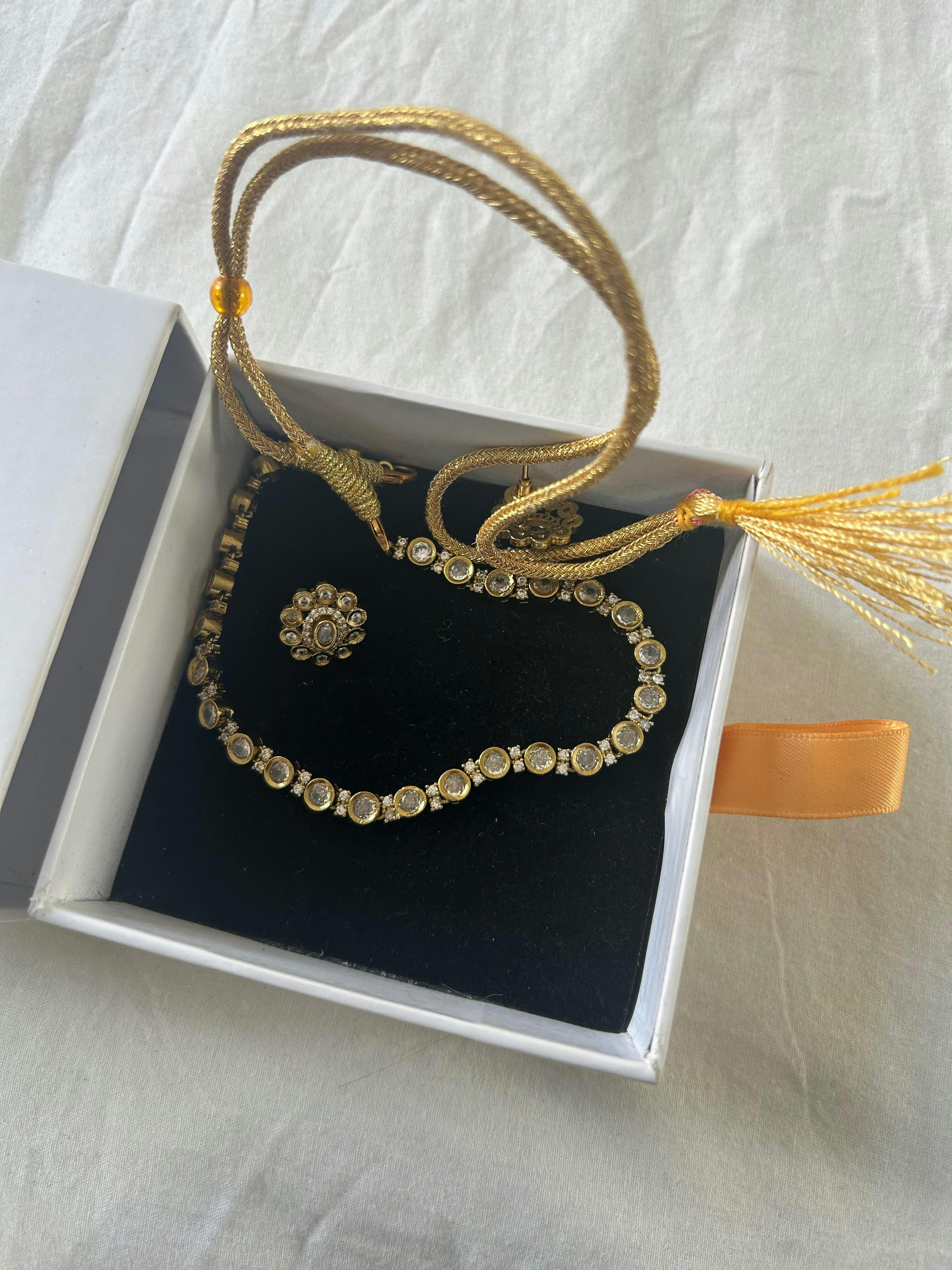 The name "Roshni" means "light" in Hindi and Urdu - a symbol of radiance, hope and celebration. True to its name, this set shines with luminous beauty, capturing the essence of festive elegance and timeless charm.