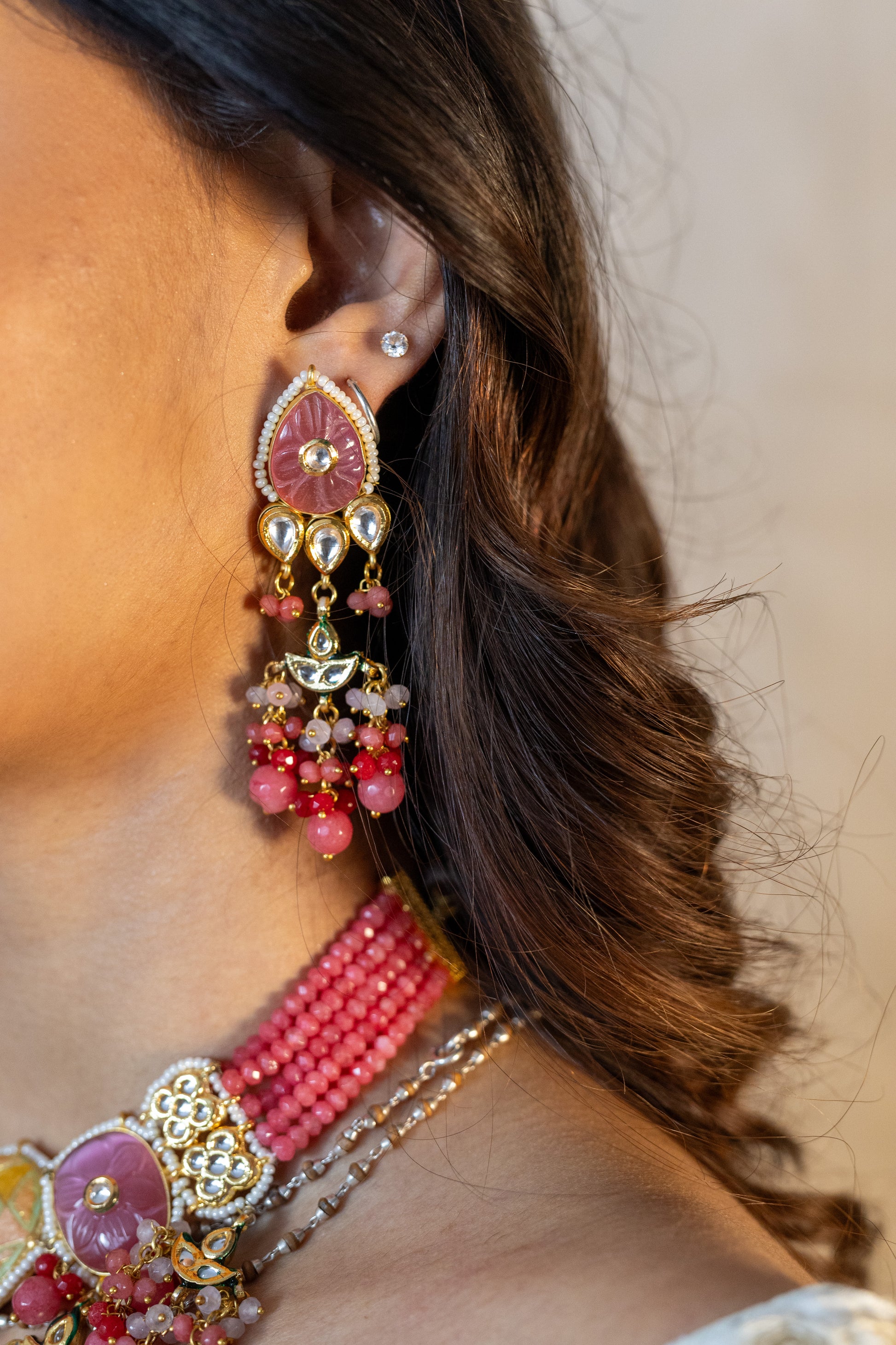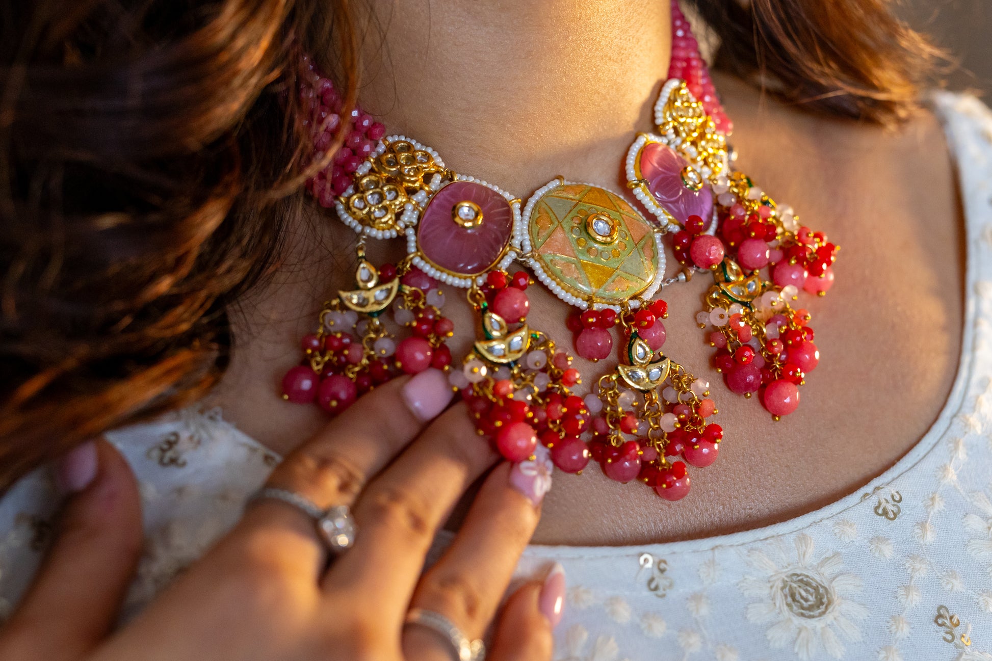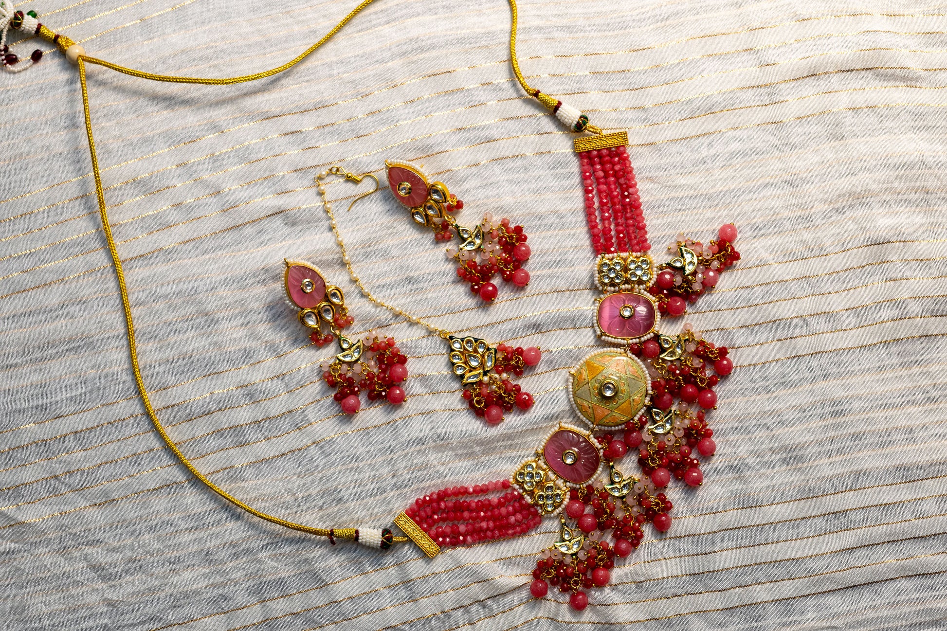 This beautiful Meenakari set consists of a necklace, a pair of earrings and a tikka.