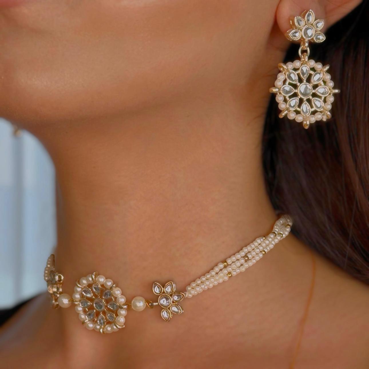 Gold-plated chocker necklace with kundan & pearl studded details. Secured with a drawstring closure